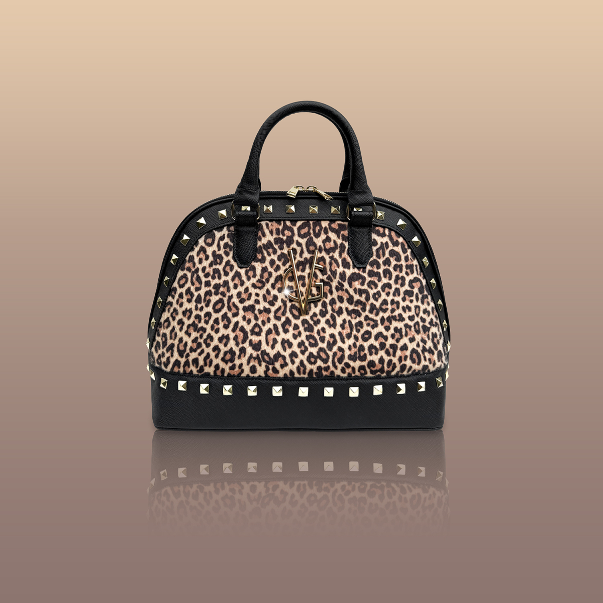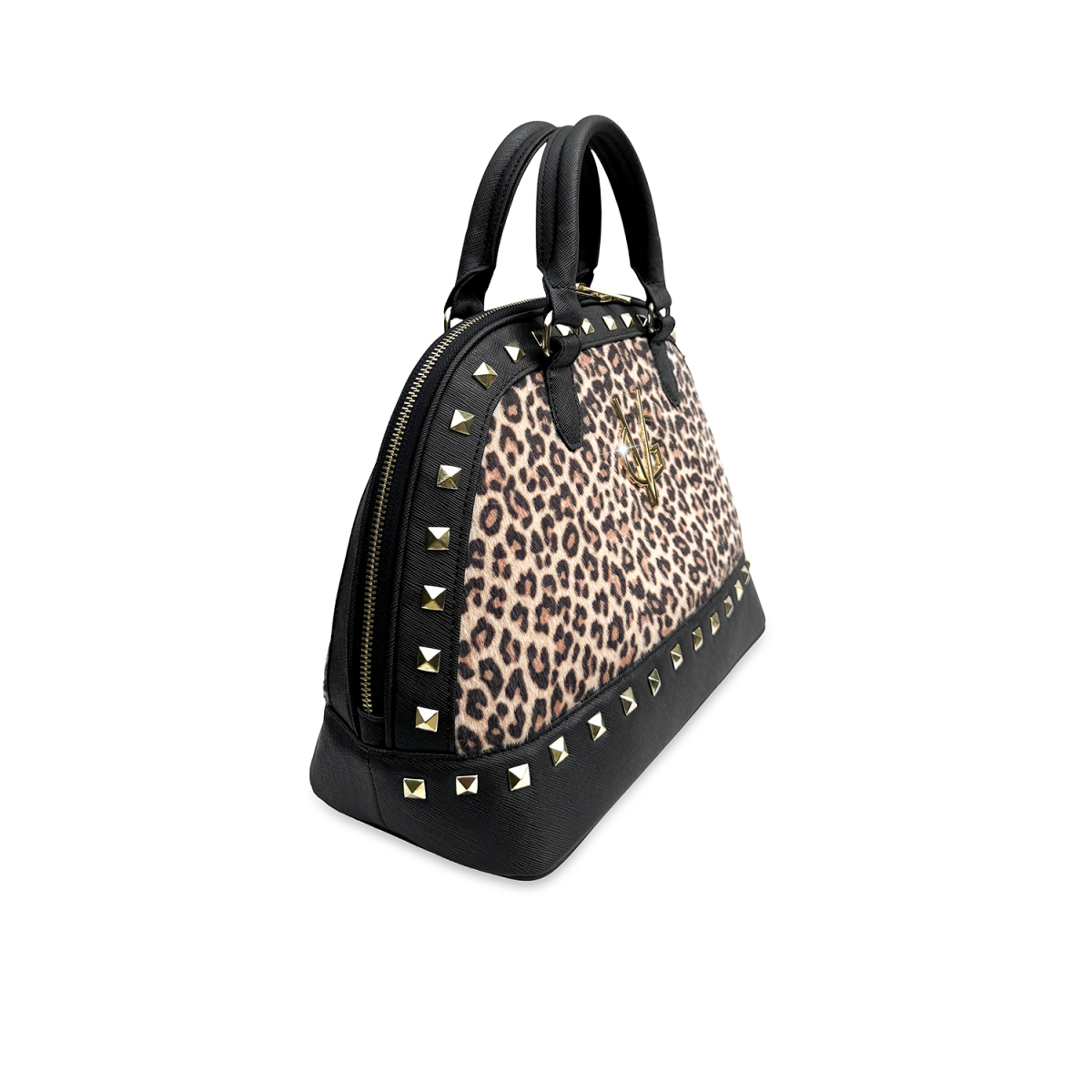 Borsa a mano di grandi dimensioni realizzata tessuto maculato & similpelle effetto saffiano con borchie:
