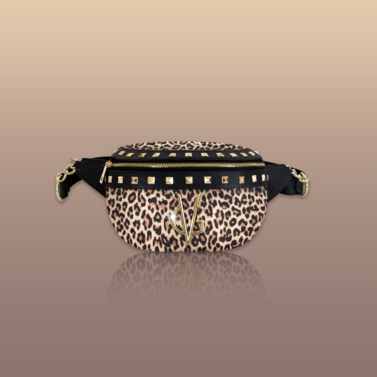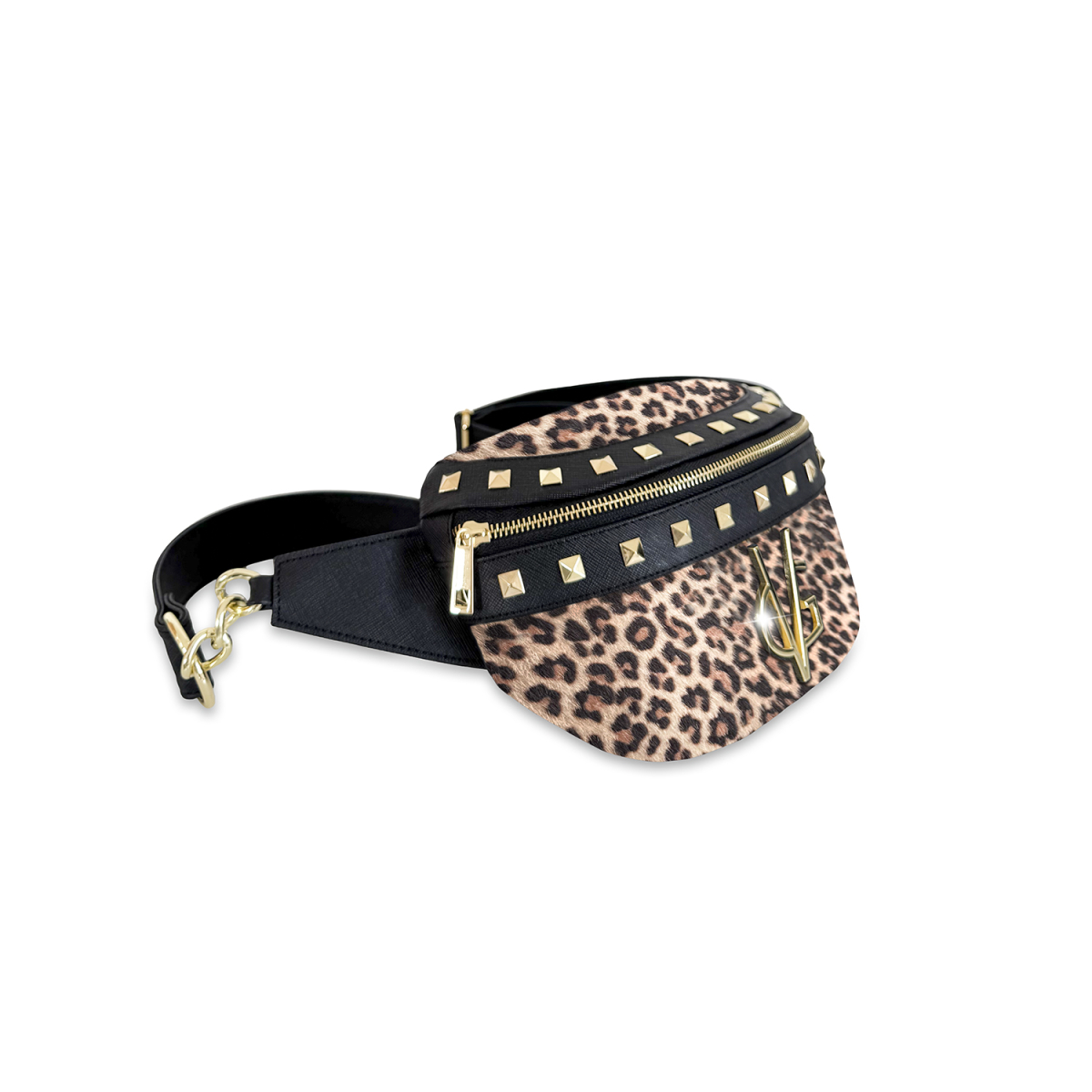 - davanti: in tessuto cavallino sintetico con stampa maculata e borchie piramidali